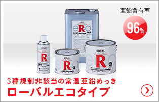 ローバルアルファエコタイプは3種の環境規制非該当に適合した環境対応型のプレミアムジンクリッチです。乾燥時間も従来の環境対応製品から短縮され、工場内塗装や屋内塗装を始め塗装環境の管理が必要とされる様々な場所での管理負担軽減が期待でき、環境への配慮が必要な場所でも安心してご使用になれます。